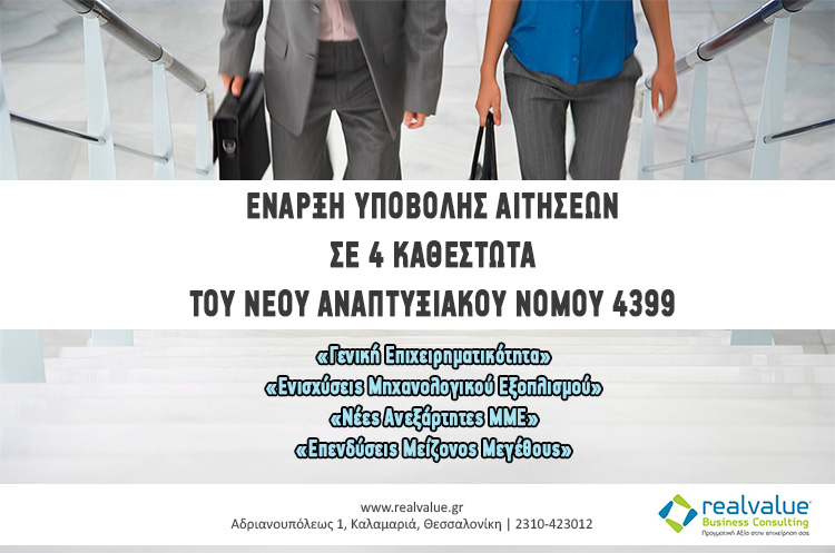 12 Οκτωβρίου η ημερομηνία έναρξης υποβολής αιτήσεων για την υπαγωγή επενδυτικών προτάσεων στα καθεστώτα «Γενική Επιχειρηματικότητα», «Ενισχύσεις Μηχανολογικού Εξοπλισμού»,«Νέες Ανεξάρτητες ΜΜΕ» και «Επενδύσεις Μείζονος Μεγέθους» του Νέου Αναπτυξιακού Νόμου 4399/2016.
